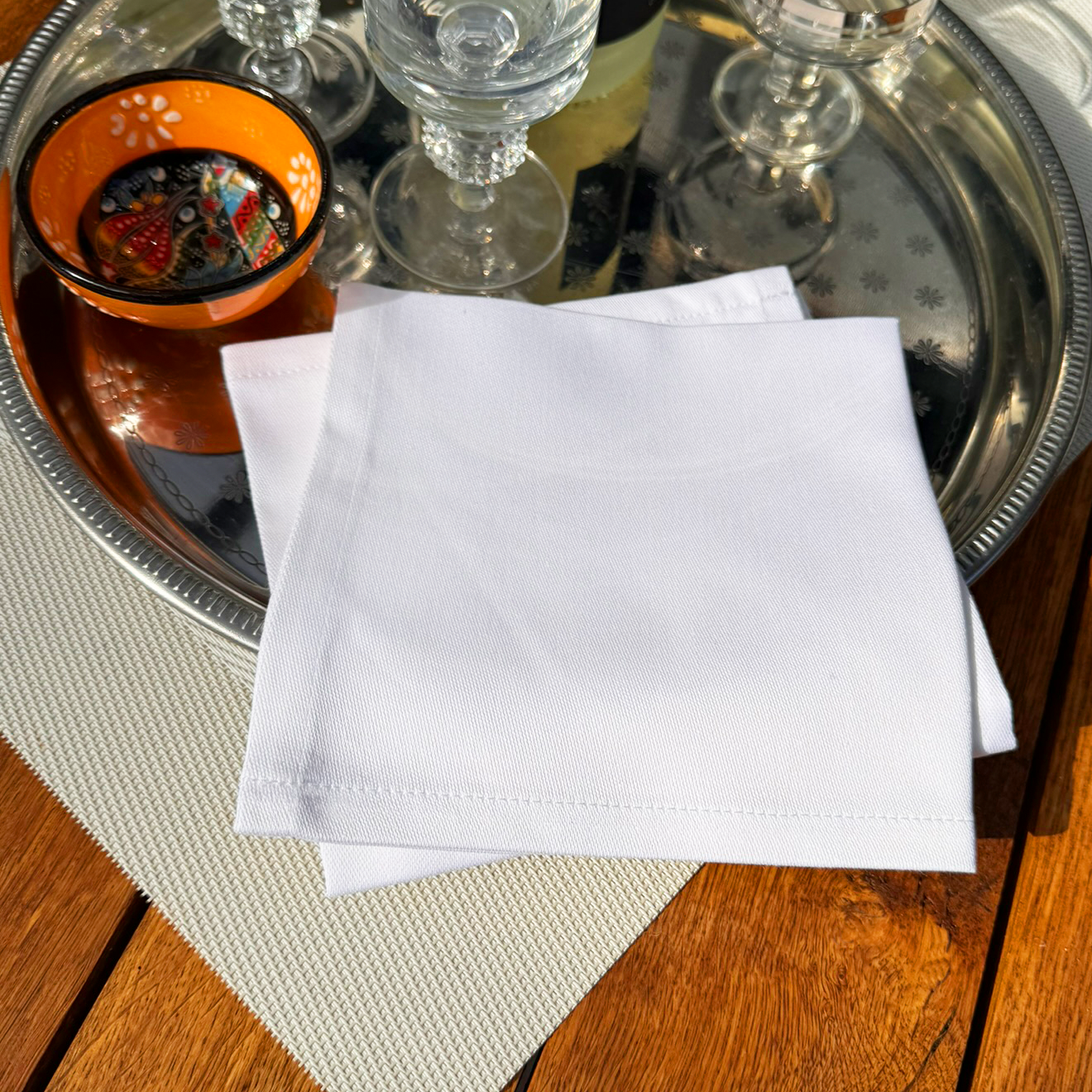 Wir bieten Ihnen hier zwanzig ganz exklusive weiße Cocktailservietten aus Stoff. Die eleganten Servietten ohne Muster sind 30x30 cm groß und besitzen ein gefaltetes Maß von 15x15 cm, sie sind also sehr klein – optimal für Fingerfood, kleine Snacks oder schmackhafte Appetizer, die man auf die Hand nehmen und dann essen kann.