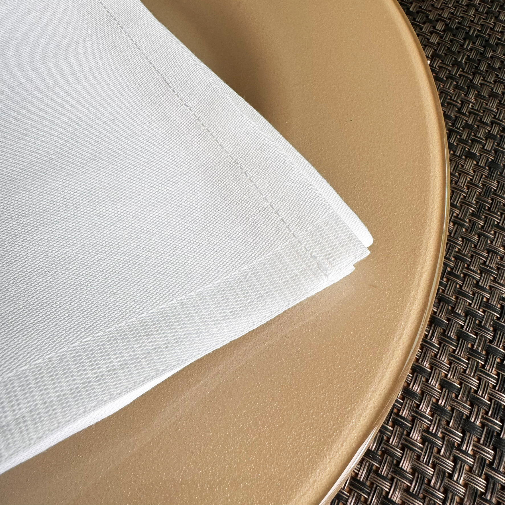 50 weiße Stoffservietten ohne Muster in der Größe 50x50. Die strahlend weißen Servietten aus 100% Vollzwirn-Baumwolle besitzen zwei Saum- und zwei feste Webkanten und sind für den professionellen Bedarf produziert.